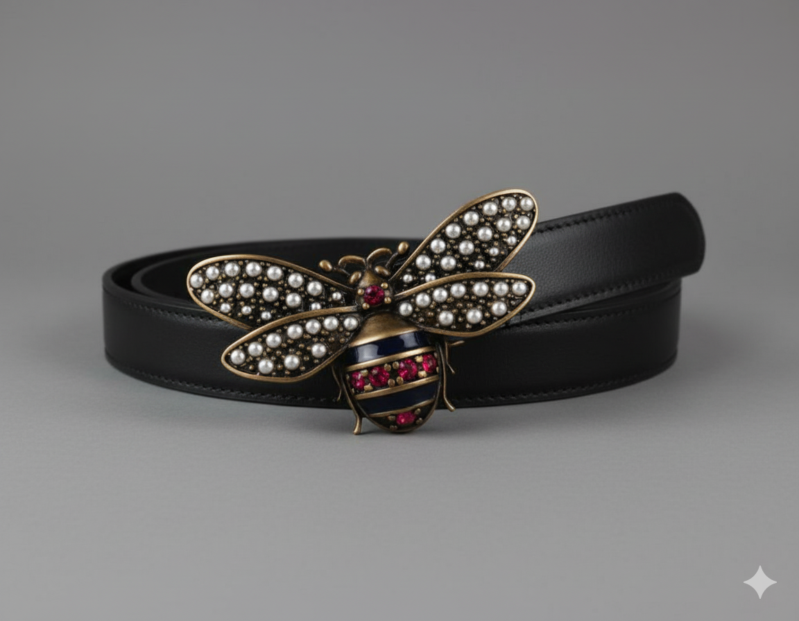 Designer bee or crystal-embellished buckle.