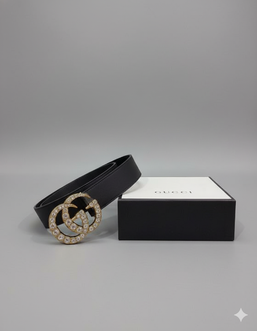 The Gucci GG Diamond Belt for Women is a luxury designer belt featuring the iconic interlocking GG buckle often embellished with crystals or diamonds for an elegant sparkle. Typically crafted in black leather with palladium-toned hardware, this belt has a width of about 1.2 inches and is made in Italy. It can be worn as either a hip or waist belt, adding a sophisticated touch to any outfit.